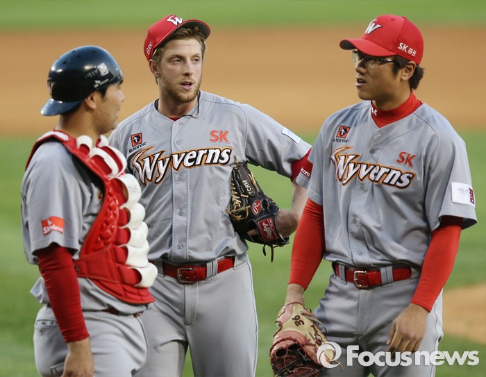 (서울=포커스뉴스) 13일 서울 잠실구장에서 열린 2016 프로야구 SK-LG 경기 3회말 2사 2,3루에서 LG 임훈의 1루 아웃 판정에 대한 합의판정 도중에 SK 투수 켈리와 1루수 박정권, 포수 이재원이 모여 대화를 하고 있다.