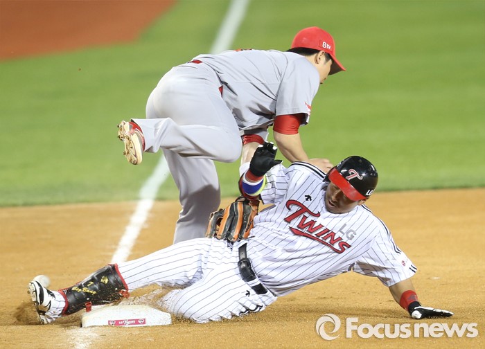 (서울=포커스뉴스) 13일 서울 잠실구장에서 열린 2016 프로야구 SK-LG 경기 6회말 LG 선두타자 이병규가 중견수를 넘기는 3루타를 치고 3루에서 슬라이딩하고 있다.