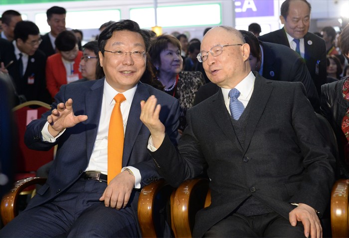 (서울=포커스뉴스) 주형환 산업통상자원부 장관이13일 중국 시안 취장국제전시센터 A홀에서 시안 실크로드박람회 주빈국 참여로 농식품, 생활용품, 의류, 화장품, 의약품 등 5대 소비재 품목의 소비재기업관, SM 융합상품관, 한국식품관(aT), K-HIT관, VR체험관(삼성전자), FTA홍보관 등 기업부스 50개사, 단체부스 50개사가 참여한 가운데 열린 ‘실크로드박람회’「국가홍보관(한국관)」개막식에 참석하여, 한국제품 전시장을 둘러보고 있다. <사진제공=산업통상자원부>