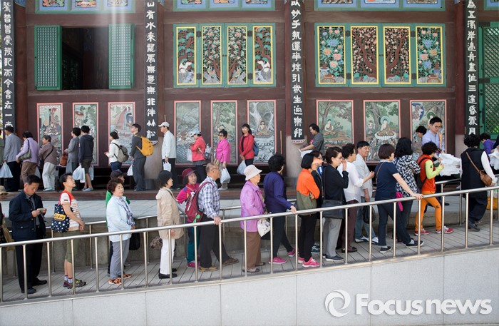 (서울=포커스뉴스) 14일 오전 서울 종로구 조계사 대웅전에서 열린 불기 2560년 부처님 오신날 봉축 법요식에서 불교신자들이 참배하기 위해 줄을 서 있다.
