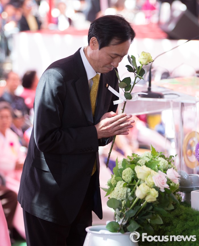 (서울=포커스뉴스) 14일 오전 서울 종로구 조계사 대웅전에서 열린 불기 2560년 부처님 오신날 봉축 법요식에서 우상호 더불어민주당 원내대표가 헌화하고 있다.