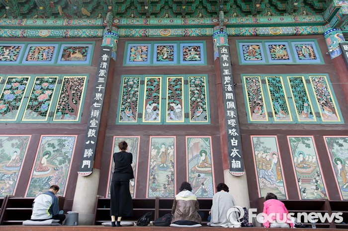 (서울=포커스뉴스) 14일 오전 서울 종로구 조계사 대웅전에서 열린 불기 2560년 부처님 오신날 봉축 법요식에서 불교 신자들이 참배하고 있다.