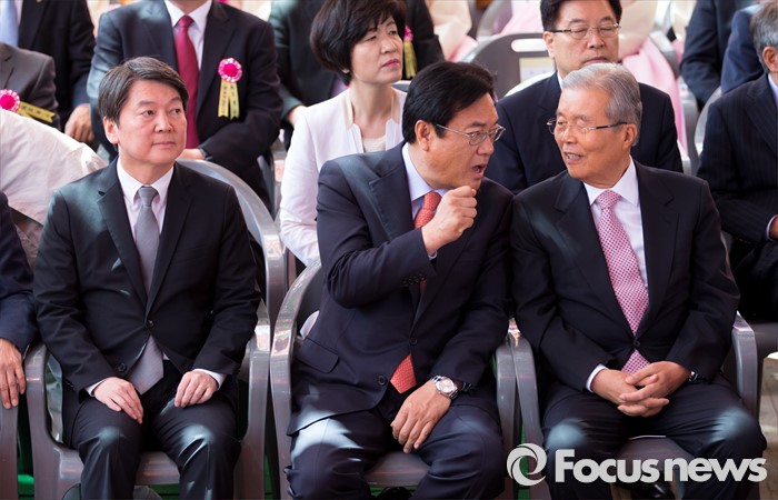 (서울=포커스뉴스) 14일 오전 서울 종로구 조계사 대웅전에서 열린 불기 2560년 부처님 오신날 봉축 법요식에서 김종인(오른쪽) 더불어민주당 비대위 대표와 정진석 새누리당 대표가 대화하고 있다. 왼쪽은 안철수 국민의당 상임공동대표가 참석해 있다.