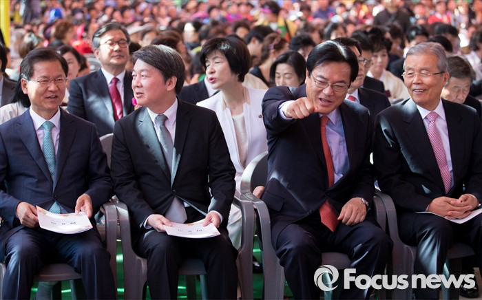 (서울=포커스뉴스) 14일 오전 서울 종로구 조계사 대웅전에서 열린 불기 2560년 부처님 오신날 봉축 법요식에서 김종인(오른쪽부터) 더불어민주당 비대위 대표와 정진석 새누리당 원내대표, 안철수 국민의당 상임공동대표, 천정배 공동대표가 대화하고 있다.