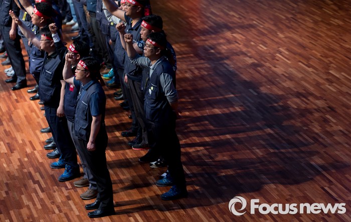 (서울=포커스뉴스) 14일 오후 서울 강서구 KBS스포츠월드에서 성과연봉제 저지를 위한 금융공기업지부 합동 대의원대회에 참석한 금융노조 조합원들이 구호를 외치고 있다.