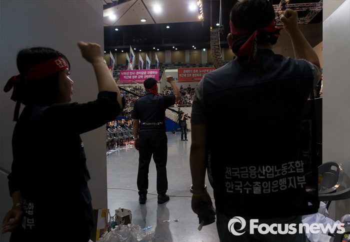 (서울=포커스뉴스) 14일 오후 서울 강서구 KBS스포츠월드에서 성과연봉제 저지를 위한 금융공기업지부 합동 대의원대회에 참석한 금융노조 조합원들이 구호를 외치고 있다.