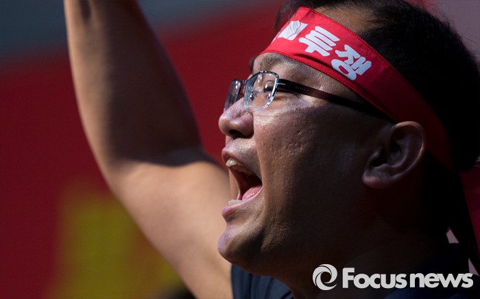 (서울=포커스뉴스) 14일 오후 서울 강서구 KBS스포츠월드에서 성과연봉제 저지를 위한 금융공기업지부 합동 대의원대회에 참석한 한 금융노조 조합원이 구호를 외치고 있다.