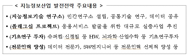미래부는 향후 추진협의회를 비롯해 공개세미나를 수차례 개최하는 등 다양한 의견수렴 절차를 거쳐 사회적 합의를 바탕으로 종합대책을 수립할 계획이다.지난 3월17일에 발표된 지능정보산업 발전전략 주요내용.<표제공=미래부>