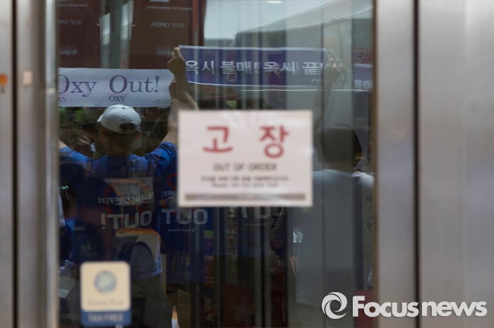 (서울=포커스뉴스) 15일 오전 서울 용산구의 한 대형마트 앞에서 환경운동연합원들이 옥시 불매를 촉구하며 기자회견을 하고 있다.