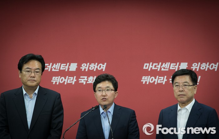 (서울=포커스뉴스) 새누리당 혁신위원장으로 임명된 김용태(가운데) 의원이 15일 오후 서울 여의도 당사에서 정진석(왼쪽) 원내대표, 김광림 정책위의장과 함께 기자회견을 하고 있다.