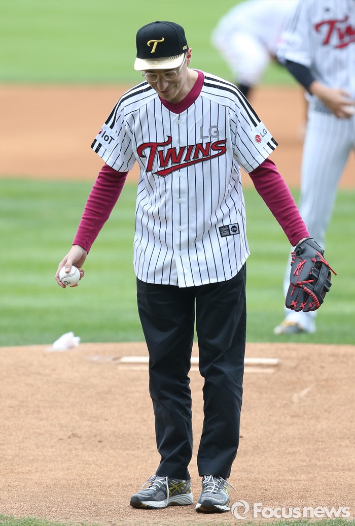 (서울=포커스뉴스) 8일 서울 잠실구장에서 열린 2016 프로야구 SK-LG 경기에서 프랑스 소설가 베르나르 베르베르가 시구에 앞서 관중에게 인사하고 있다.