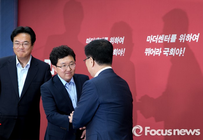 (서울=포커스뉴스) 김광림(오른쪽) 새누리당 정책위의장과 혁신위원장으로 임명된 김용태(가운데) 의원이 15일 오후 서울 여의도 당사에서 기자회견을 마친 뒤 악수하고 있다. 왼쪽은 정진석 원내대표.