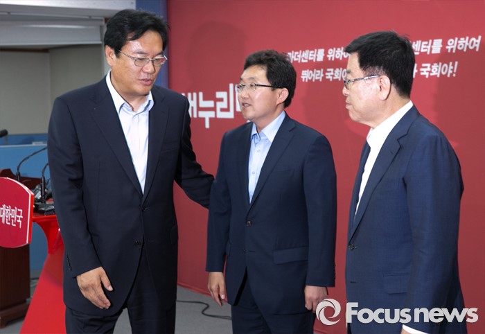 (서울=포커스뉴스) 정진석(왼쪽) 새누리당 원내대표와 혁신위원장으로 임명된 김용태(가운데) 의원이 15일 오후 서울 여의도 당사에서 기자회견을 마친 뒤 퇴장하고 있다. 오른쪽은 김광림 정책위의장.