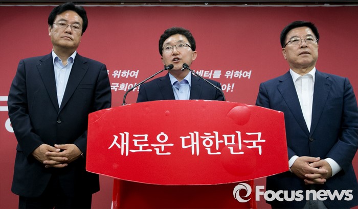 (서울=포커스뉴스) 새누리당 혁신위원장으로 임명된 김용태(가운데) 의원이 15일 오후 서울 여의도 당사에서 정진석(왼쪽) 원내대표, 김광림 정책위의장과 함께 기자회견을 하고 있다.