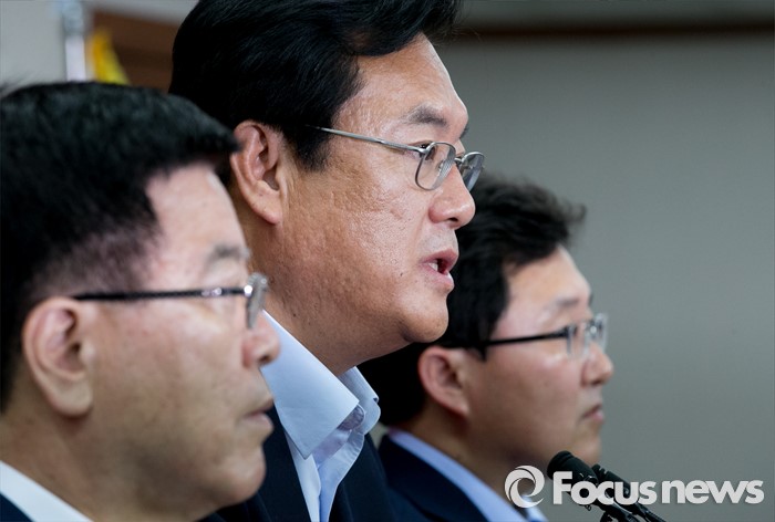 (서울=포커스뉴스) 정진석(가운데) 새누리당 원내대표와 김광림(왼쪽) 정책위의장이 15일 오후 서울 여의도 당사에서 혁신위원장으로 임명된 김용태 의원과 함께 기자회견을 하고 있다.