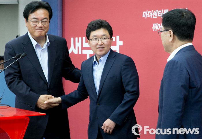 (서울=포커스뉴스) 정진석(왼쪽) 새누리당 원내대표와 혁신위원장으로 임명된 김용태(가운데) 의원이 15일 오후 서울 여의도 당사에서 기자회견을 마친 뒤 악수하고 있다. 오른쪽은 김광림 정책위의장.