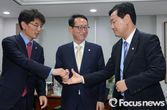 (서울=포커스뉴스) 김도읍(가운데) 새누리당 원내수석부대표, 박완주(왼쪽) 더불어민주당 원내수석부대표, 김관영 국민의당 원내수석부대표가 15일 오후 서울 여의도 국회 의원회관에서 19대 국회 마지막 본회의 안건 및 20대 국회 원구성 협상 등을 논의하기에 앞서 취재진을 향해 포즈를 취하고 있다.