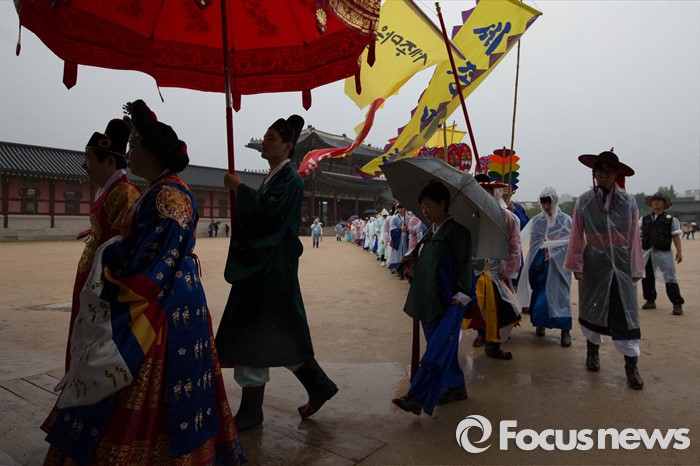 (서울=포커스뉴스) 세종대왕 탄신 619주년인 15일 오후 서울 종로구 경복궁 일대에서 세종대왕 어가행렬이 재현되고 있다.