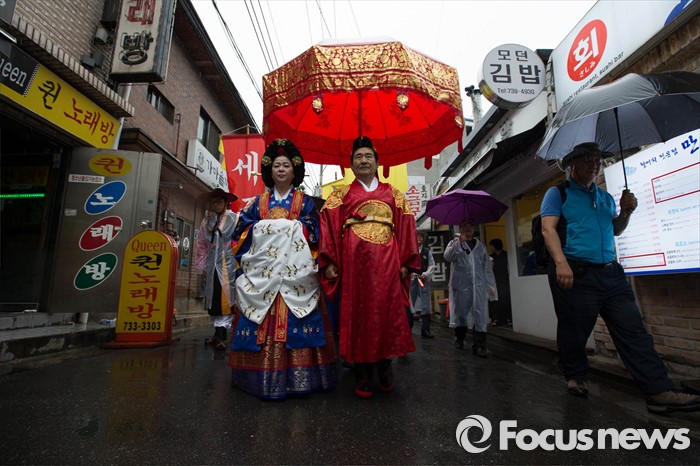 (서울=포커스뉴스) 세종대왕 탄신 619주년인 15일 오후 서울 종로구 통인시장 일대에서 세종대왕 어가행렬이 재현되고 있다.