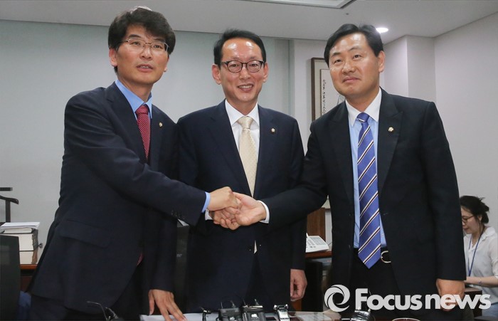 (서울=포커스뉴스) 김도읍(가운데) 새누리당 원내수석부대표, 박완주(왼쪽) 더불어민주당 원내수석부대표, 김관영 국민의당 원내수석부대표가 15일 오후 서울 여의도 국회 의원회관에서 19대 국회 마지막 본회의 안건 및 20대 국회 원구성 협상 등을 논의하기에 앞서 취재진을 향해 포즈를 취하고 있다.