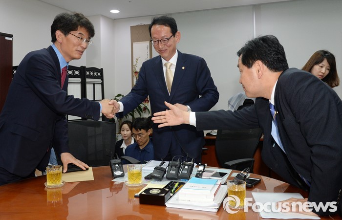 (서울=포커스뉴스) 김도읍(가운데) 새누리당 원내수석부대표, 박완주(왼쪽) 더불어민주당 원내수석부대표, 김관영 국민의당 원내수석부대표가 15일 오후 서울 여의도 국회 의원회관에서 19대 국회 마지막 본회의 안건 및 20대 국회 원구성 협상 등을 논의하기에 앞서 인사하고 있다.