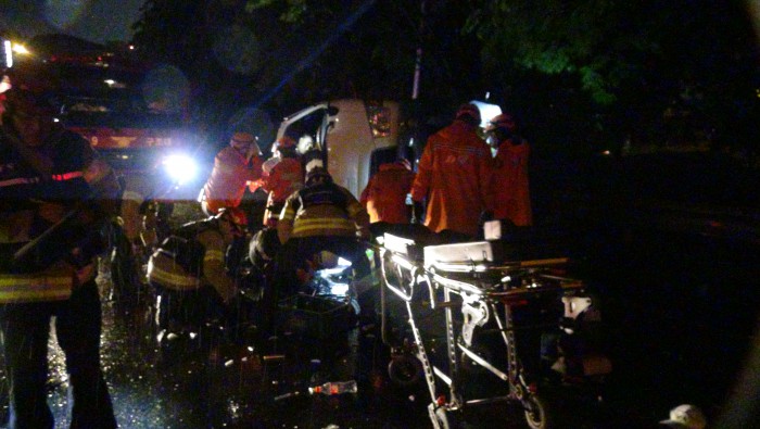 경찰은 사고 차량이 빗길에 미끄러진 것으로 보고 정확한 원인을 조사 중이다.15일 오후 서울 송파구 올림픽대로 미사리방향에서 음식물 수거 차량이 전도되는 사고가 났다. <사진제공=서울 송파소방서>