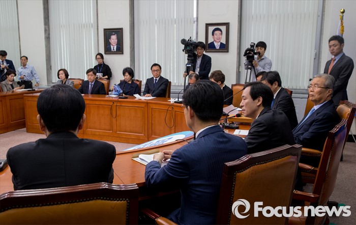 (서울=포커스뉴스) 16일 오전 서울 여의도 국회에서 열린 더불어민주당 제34차 비상대책위원회의에 참석한 우상호(앞줄 왼쪽 세번째) 원내대표가 모두발언 하고 있다.