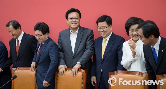 (서울=포커스뉴스) 정진석 새누리당 원내대표와 김광림 정책위의장, 김용태 혁신위원장을 비롯한 비대위원들이 16일 오전 서울 여의도 국회에서 상견례를 갖고 취재진을 향해 포즈를 취하고 있다. 왼쪽부터 홍문표 사무총장 대행, 김용태 혁신위원장, 정진석 원내대표, 김광림 정책위의장, 이혜훈, 김영우 비대위원.
