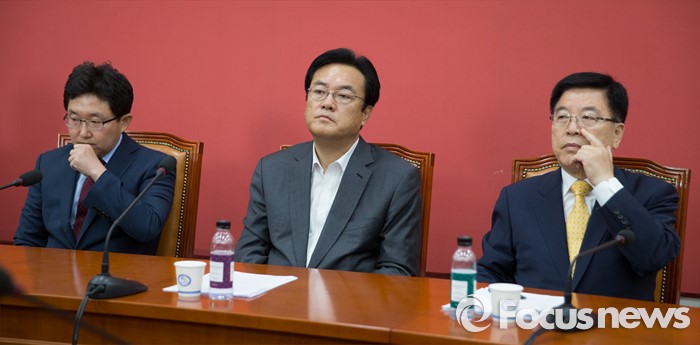 (서울=포커스뉴스) 정진석(가운데) 새누리당 원내대표와 김광림(오른쪽) 정책위의장, 김용태 혁신위원장이 16일 오전 서울 여의도 국회에서 비상대책위원회 상견례에 참석하고 있다.
