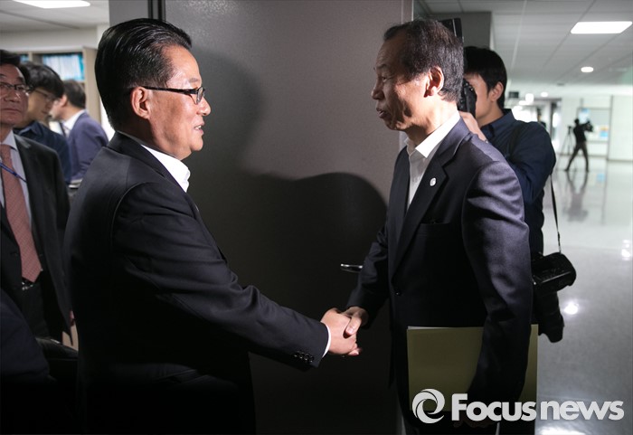 (서울=포커스뉴스) 박지원(왼쪽) 국민의당 원내대표가 16일 오전 서울 여의도 국회 의원회관을 방문한 최문순 강원도지사와 현안 관련 면담을 마친 뒤 악수하고 있다.