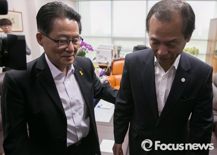 (서울=포커스뉴스) 박지원(왼쪽) 국민의당 원내대표가 16일 오전 서울 여의도 국회 의원회관을 방문한 최문순 강원도지사와 현안 관련 면담을 마친 뒤 나서고 있다.