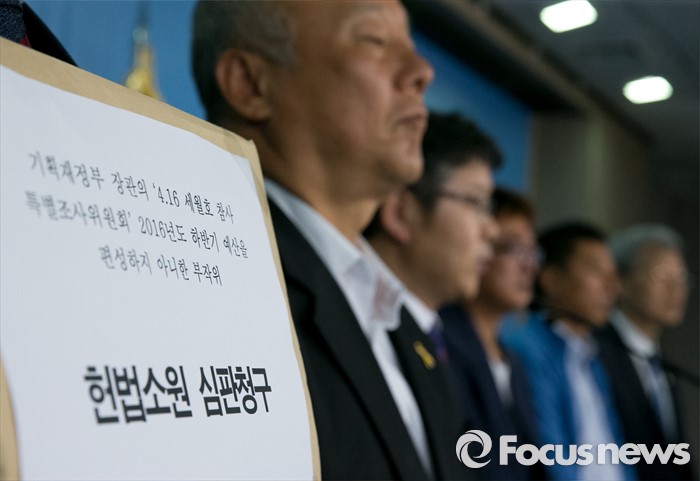 (서울=포커스뉴스) 16일 오전 서울 여의도 국회 정론관에서 민주사회를 위한 변호사모임 등 관계자들이 4·16 세월호참사 특별조사위원회 하반기 예산 미편성 위법에 따른 헌법소원 및 공익감사 청구 기자회견을 하고 있다.