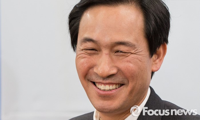 (서울=포커스뉴스) 16일 오전 서울 여의도 국회 더불어민주당 원내대표회의실에서 우상호 원내대표가 최문순 강원도지사와의 면담에 앞서 밝게 웃고 있다.