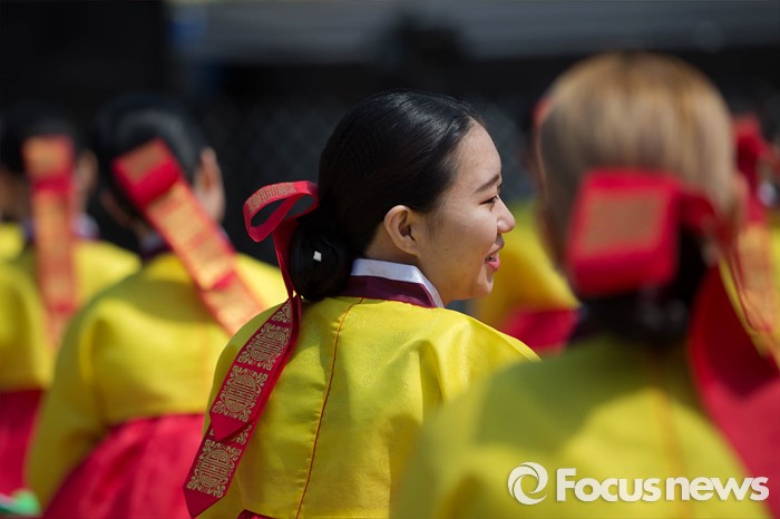 (서울=포커스뉴스) 16일 오전 서울 중구 남산골 한옥마을 천우각 광장에서 열린 제44회 성년의 날 행사에 참석한 학생들이 전통 성년례를 올리고 있다.