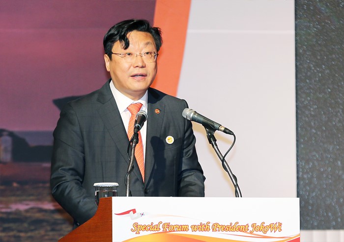 (서울=포커스뉴스) 주형환 산업통상자원부 장관이 16일 오전서울 중구 소공동 롯데호텔 크리스탈볼룸에서 조코 위도도(Joko Widodo) 인도네시아 대통령과 한-인니 양국 정부 및 기업인 등 관계자 400여명이 참석한 가운데 열린 한-인도네시아 비즈니스 포럼에 참석해 축사를 하고 있다. <사진제공=산업통상자원부>