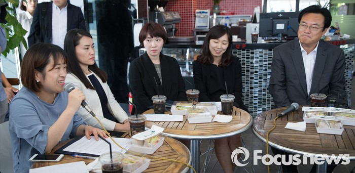 (서울=포커스뉴스) 정진석(오른쪽) 새누리당 원내대표가 16일 오후 서울 여의도 한강공원의 한 카페에서 여성 당직자들과 '3040여성당직자 브라운백 미팅'을 갖고 있다.
