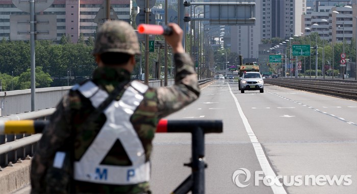 (서울=포커스뉴스) 제401차 민방위의 날인 16일 오후 서울 용산구 반포대교에서 군·경 관계자들이 합동 전시 교통통제소 설치 민방공대피훈련을 하고 있다.