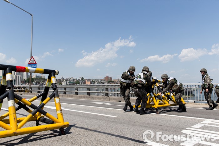 (서울=포커스뉴스) 제401차 민방위의 날인 16일 오후 서울 용산구 반포대교에서 군·경 관계자들이 합동 전시 교통통제소 설치 민방공대피훈련을 하고 있다.