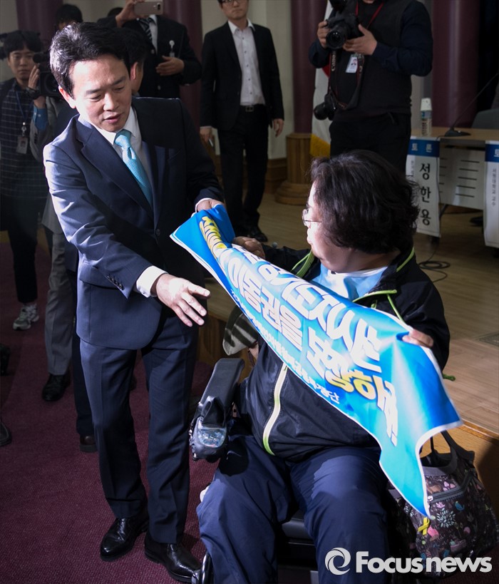 (서울=포커스뉴스) 16일 오후 서울 여의도 국회 의원회관에서 열린 '20대 국회, 협치 가능한가' 토론회에 참석한 남경필 경기도지사의 인사말 도중 장애인 이동권 보장을 요구하는 경기420장애인차별철폐공동투쟁단 등이 남 지사와 면담을 요구하며 손피켓을 들고 있다.