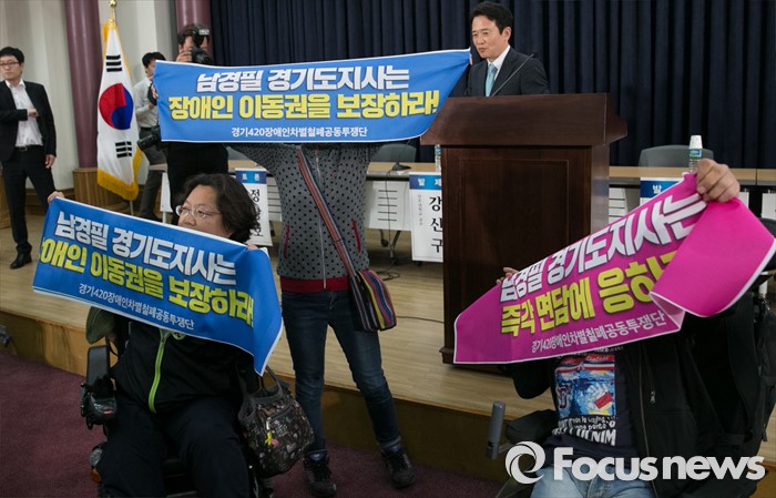 (서울=포커스뉴스) 16일 오후 서울 여의도 국회 의원회관에서 열린 '20대 국회, 협치 가능한가' 토론회에 참석한 남경필 경기도지사의 인사말 도중 장애인 이동권 보장을 요구하는 경기420장애인차별철폐공동투쟁단 등이 남 지사와 면담을 요구하며 손피켓을 들고 있다.
