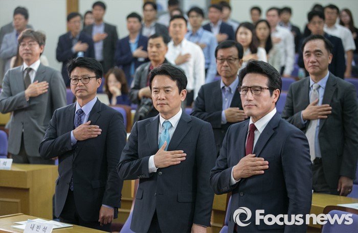 (서울=포커스뉴스) 16일 오후 서울 여의도 국회 의원회관에서 열린 '20대 국회, 협치 가능한가' 토론회에 참석한 남경필(가운데) 경기도지사, 정병국 새누리당 의원 등이 국기에 대한 경례를 하고 있다.