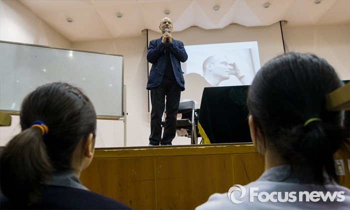 (서울=포커스뉴스) 16일 오후 서울 종로구 서울예술고등학교를 찾은 프랑스 작가 베르나르 베르베르가 '오늘날의 예술적 지능'이란 주제로 학생들에게 강연하고 있다.
