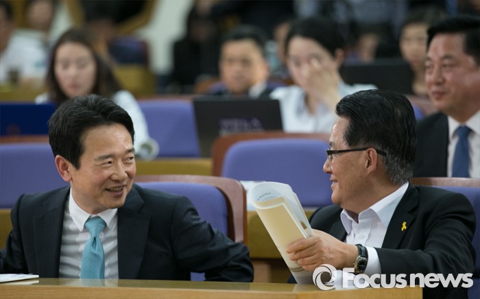 (서울=포커스뉴스) 16일 오후 서울 여의도 국회 의원회관에서 열린 '20대 국회, 협치 가능한가' 토론회에 참석한 남경필(왼쪽) 경기도지사와 박지원 국민의당 원내대표가 대화하고 있다.