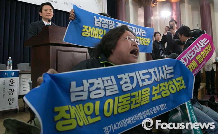 (서울=포커스뉴스) 16일 오후 서울 여의도 국회 의원회관에서 열린 '20대 국회, 협치 가능한가' 토론회에 참석한 남경필 경기도지사의 인사말 도중 장애인 이동권 보장을 요구하는 경기420장애인차별철폐공동투쟁단 등이 남 지사와 면담을 요구하며 손피켓을 들고 있다.