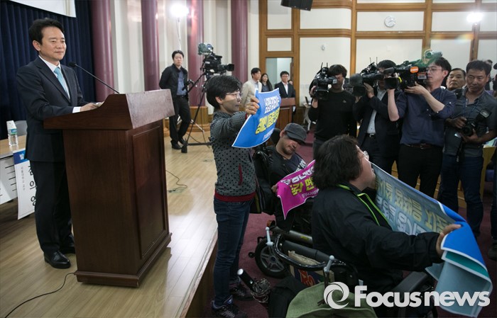 (서울=포커스뉴스) 16일 오후 서울 여의도 국회 의원회관에서 열린 '20대 국회, 협치 가능한가' 토론회에 참석한 남경필 경기도지사의 인사말 도중 장애인 이동권 보장을 요구하는 경기420장애인차별철폐공동투쟁단 등이 남 지사와 면담을 요구하며 손피켓을 들고 있다.
