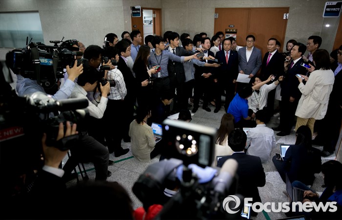 (서울=포커스뉴스) 16일 오후 서울 여의도 국회 정론관에서 새누리당 초·재선 의원 및 당선인들이 당 혁신위와 비대위원 재검토를 요구하는 성명서 발표 기자회견을 마친 뒤 취재진 질문에 답하고 있다. 왼쪽부터 이장우, 이우현, 박대출, 박덕흠, 김태흠, 함진규 의원.