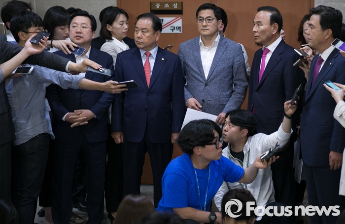 (서울=포커스뉴스) 16일 오후 서울 여의도 국회 정론관에서 새누리당 초·재선 의원 및 당선인들이 당 혁신위와 비대위원 재검토를 요구하는 성명서 발표 기자회견을 마친 뒤 취재진 질문에 답하고 있다. 왼쪽부터 이장우, 이우현, 박대출, 박덕흠, 김태흠 의원.