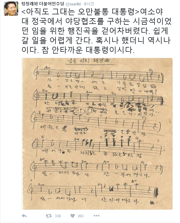 한편 박근혜 대통령은 지난 13일 여야 3당 원내지도부와의 회동에서 '임을 위한 행진곡'의 5·18 공식기념곡 지정 문제에 대해 보훈처에 잘 해결할 수 있는 방법을 찾아볼 것을 지시하겠다고 한 바 있다.정청래 더불어민주당 의원 트위터 캡쳐 화면. 2016.05.16 류연정 기자 j4837415@focus.co.kr