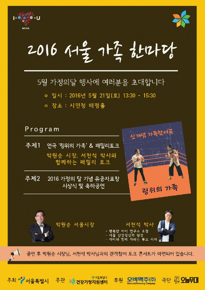 오비맥주는 오는 21일 오후 1시30분 서울시, 서울건강가정지원센터와 함께 시민청 태평홀에 마련한 '2016서울 가족한마당' 행사에서 건전음주 캠페인 프로그램 '패밀리토크' 연극을 무대에 올린다고 16일 밝혔다.