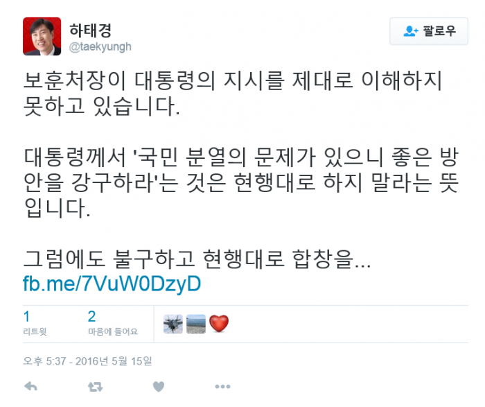 하 의원은 이날 오전 트위터에 이같이 밝히며 "대통령께서 '국민 분열의 문제가 있으니 좋은 방안을 강구하라'고 한 것은 현행대로 하지 말라는 뜻"이라고 말했다.